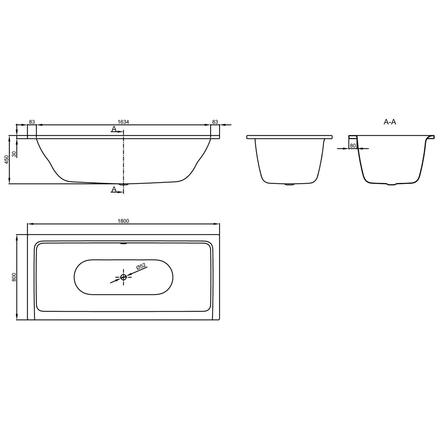 - Stahlbadewanne mit zwei Rückenschrägen und Mittelablauf