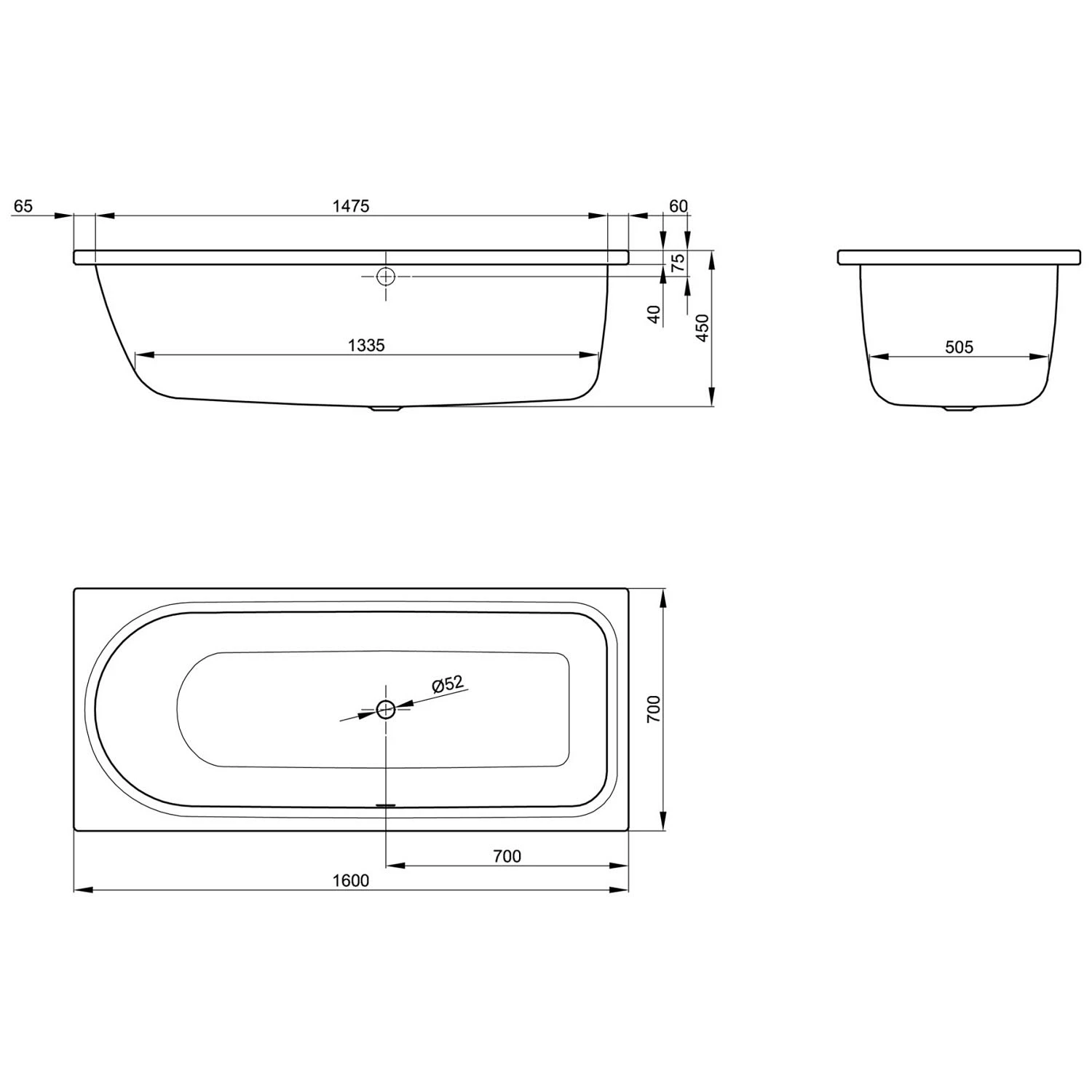 Bette Ocean Badewanne 160 x 70 x 45 cm, Überlauf vorne