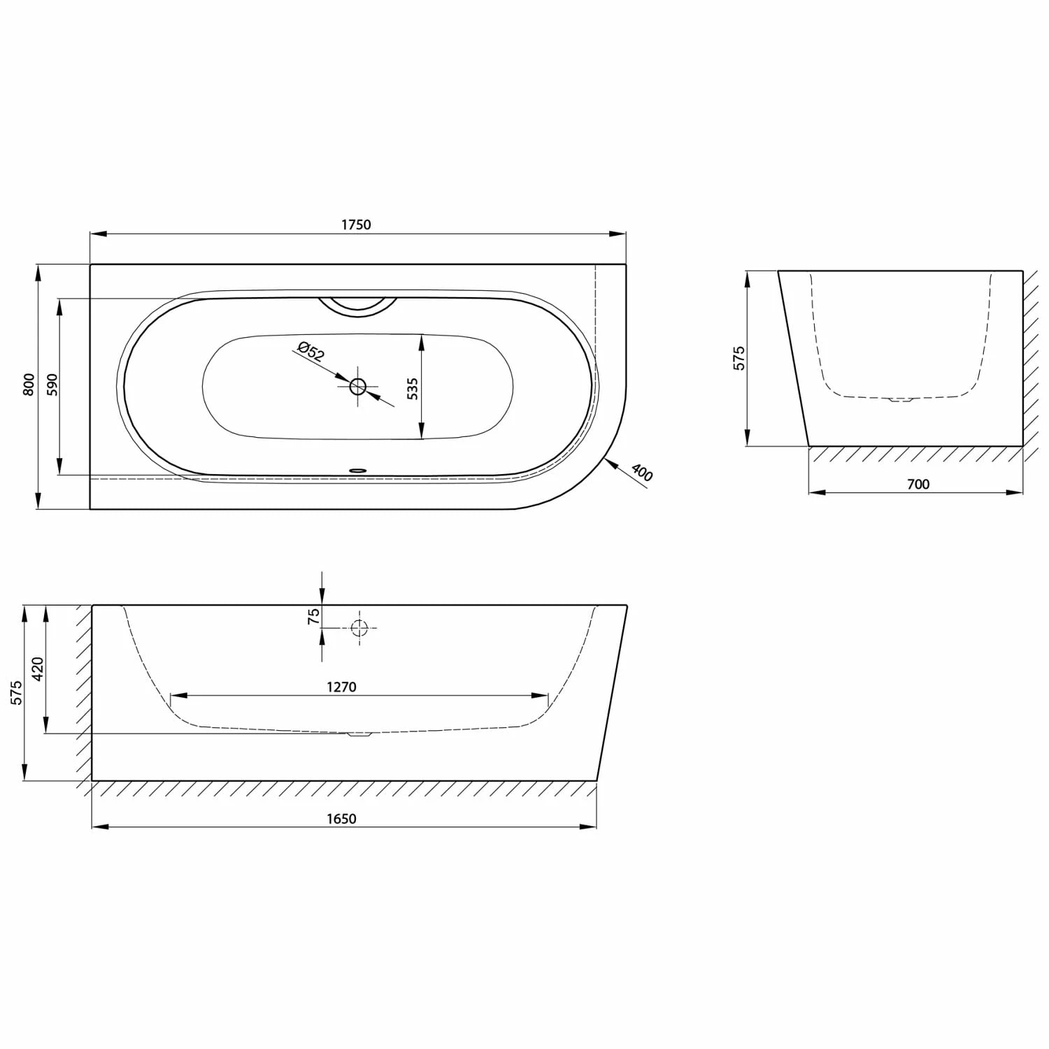 - Stahlbadewanne mit zwei Rückenschrägen und Mittelablauf