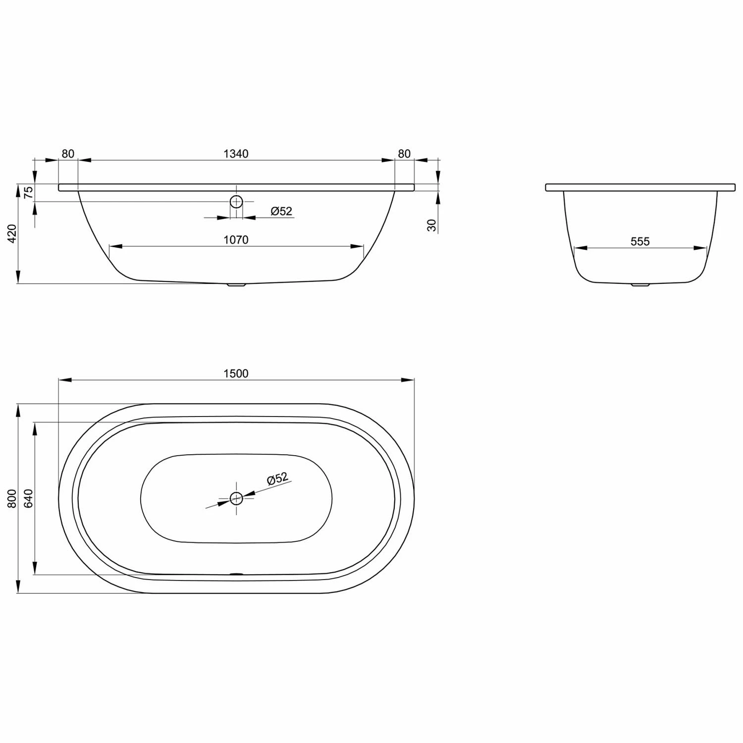 - Klassisch-ovales Wannenmodell mit großzügigem ergonomischen Wanneninnenkörper und Mittelablauf