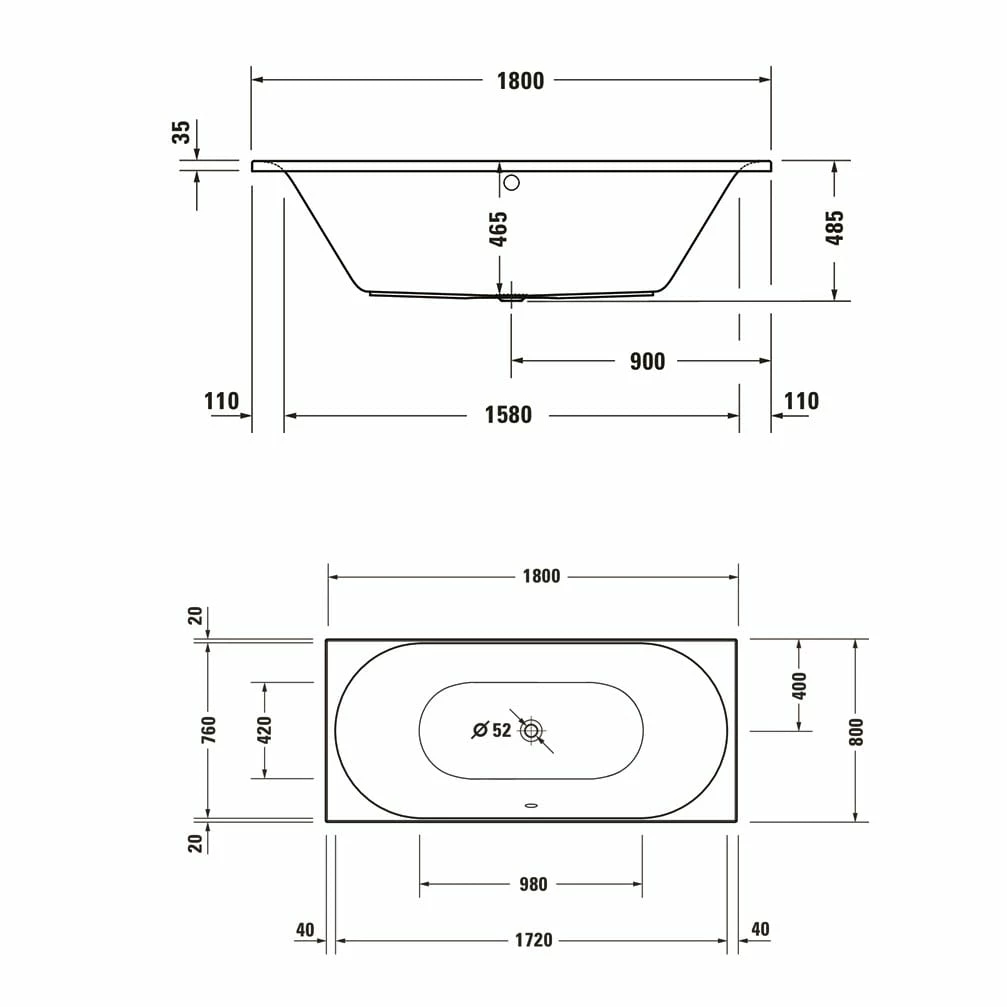 Duravit D-Neo Rechteck-Whirlwanne 180 x 80 cm, Einbauversion, Ab- und Überlauf mittig