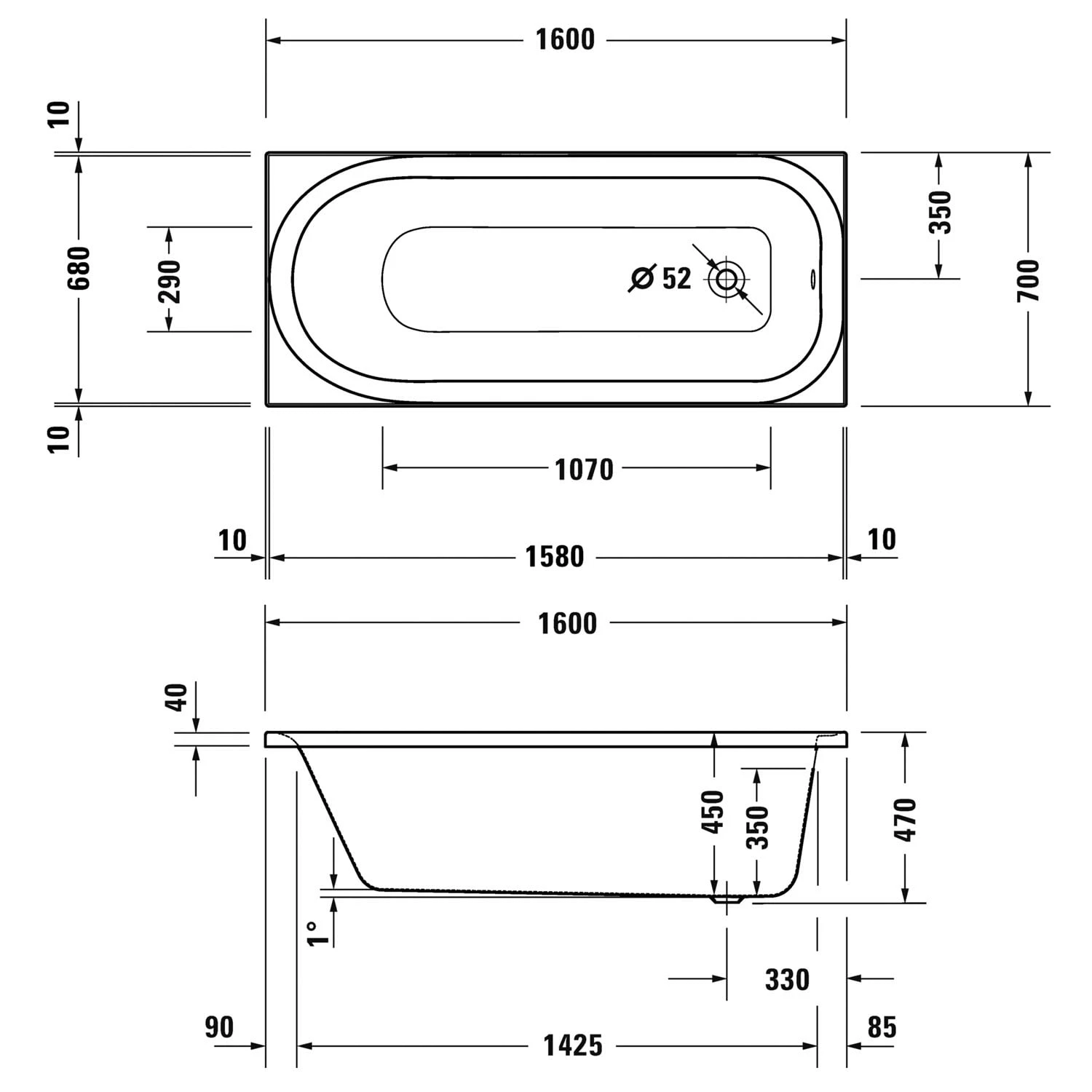 - Ablauf am Fußende, Ø 5,2 cm