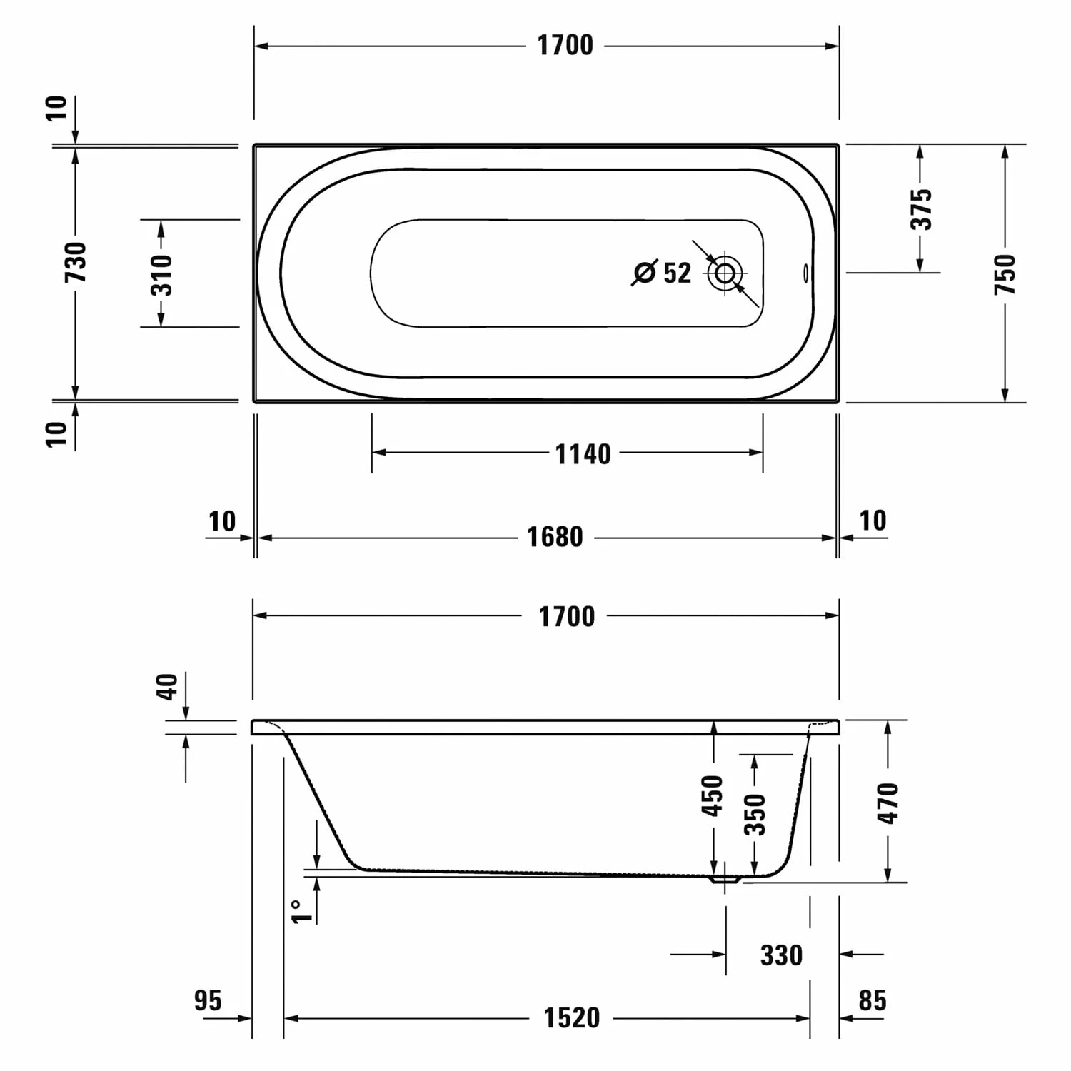 - Ablauf am Fußende, Ø 5,2 cm