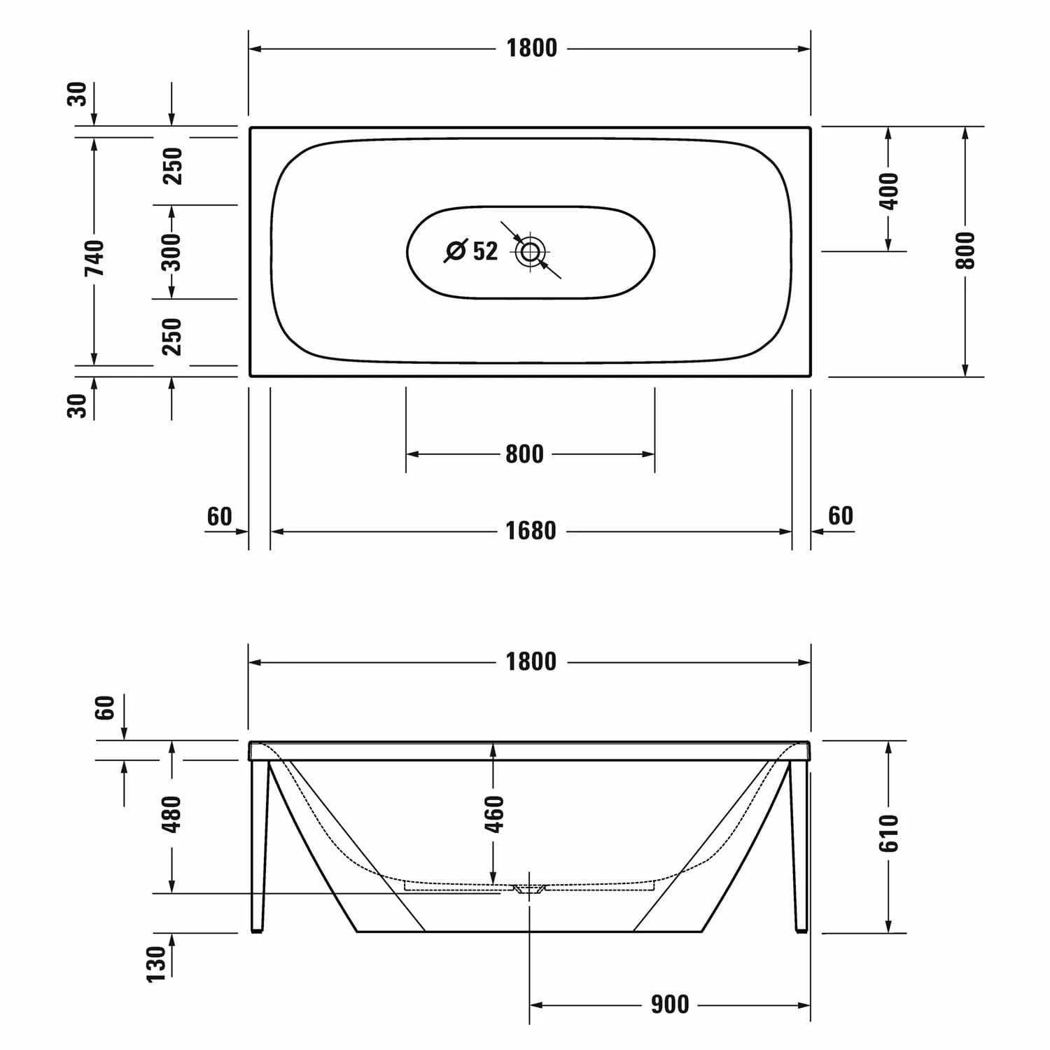 Duravit XViu Badewanne Rechteck 180 x 80 cm, mit 2 Rückenschrägen, Freistehend