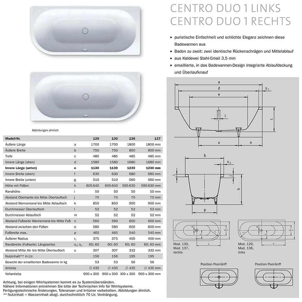 Kaldewei Centro Duo 1 links 129 Eckbadewanne 170 x 75 cm mit Antislip