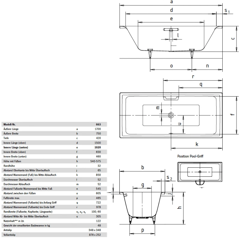 Kaldewei Puro Duo 663 Badewanne 170 x 75 cm mit Griffbohrung
