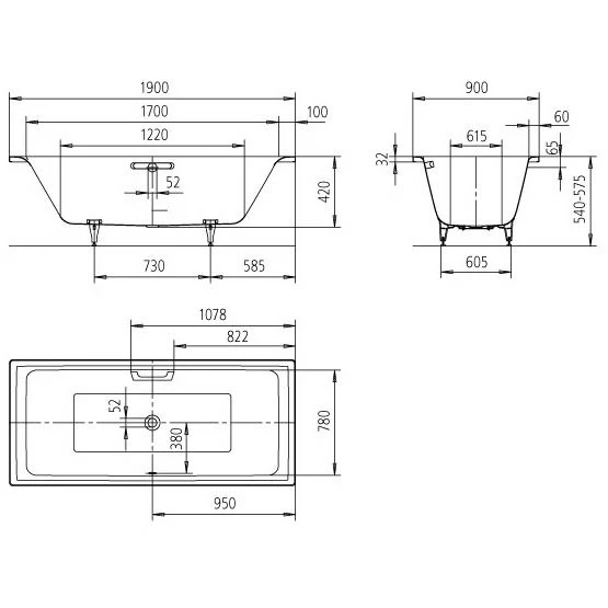 Kaldewei Puro Duo 665 Badewanne 190 x 90 cm, rechteckig mit Schwalleinlauf inkl. integriertem Überlauf