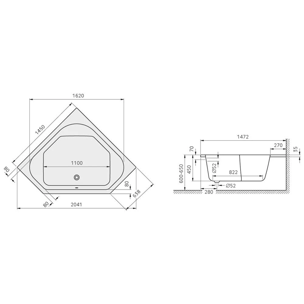 Koralle T200 Eck-Badewanne eckig 145 x 145 x 45 cm