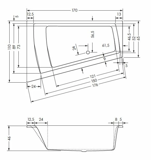 | Abmessungen | L: 170 B: 110/65 H: 46 cm |