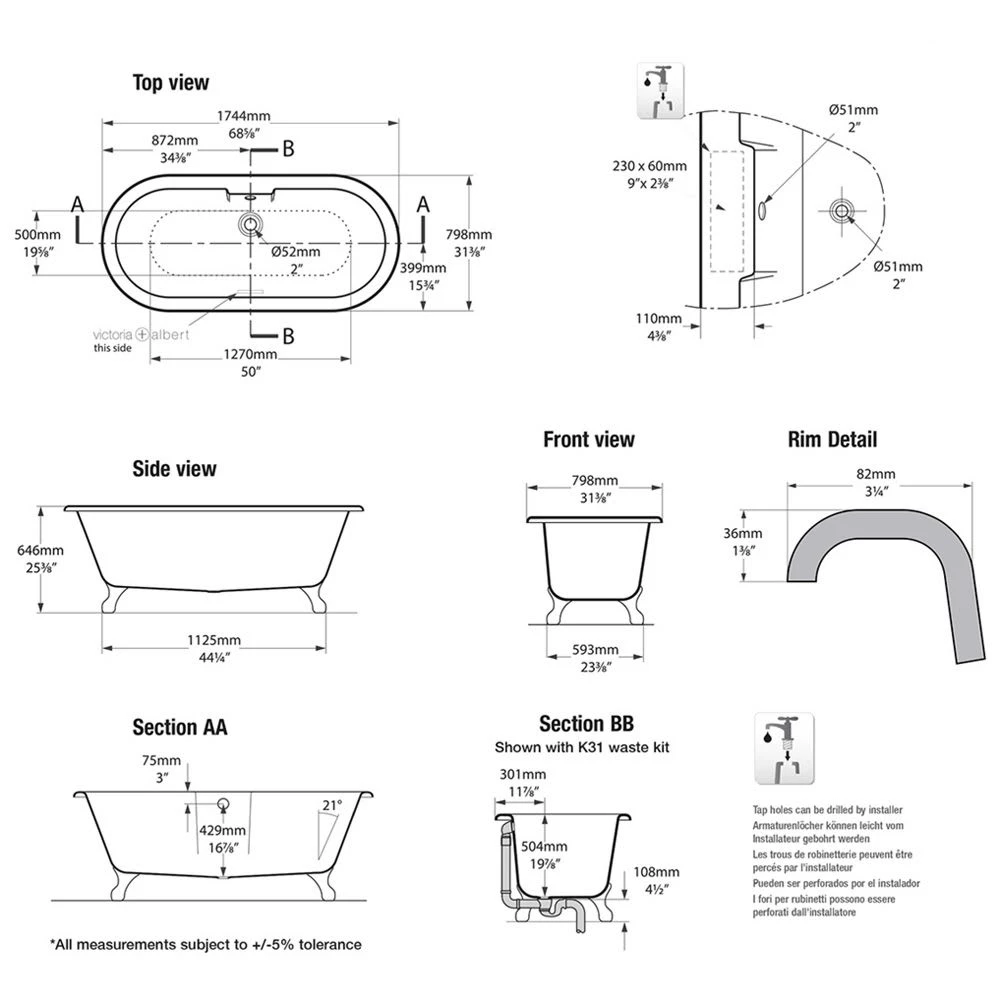 Ohne Löcher für Wannenrandarmaturen. Geeignet für freistehende oder an der Wand montierte Wanneneinläufe; Montage von Armaturen auf dem Wannenrand möglich, für die aber vor Ort Löcher gebohrt werden müssen.