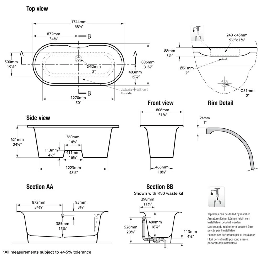 Ohne Löcher für Wannenrandarmaturen. Geeignet für freistehende oder an der Wand montierte Wanneneinläufe; oder für Messing Garnituren, für die speziell vor Ort Löcher gebohrt werden müssen.