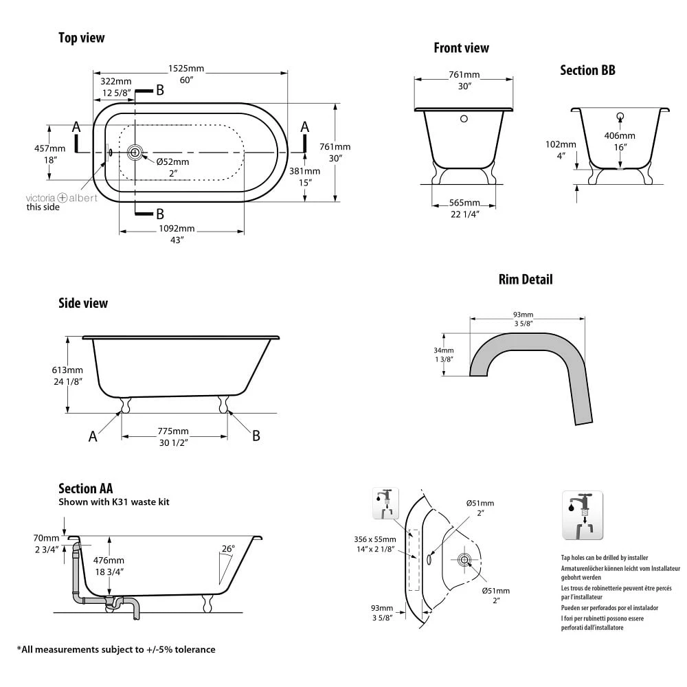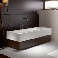 Ohne Löcher für Wannenrandarmaturen. Geeignet für freistehende oder an der Wand montierte Wanneneinläufe; Montage von Armaturen auf dem Wannenrand möglich, für die aber vor Ort Löcher gebohrt werden müssen.